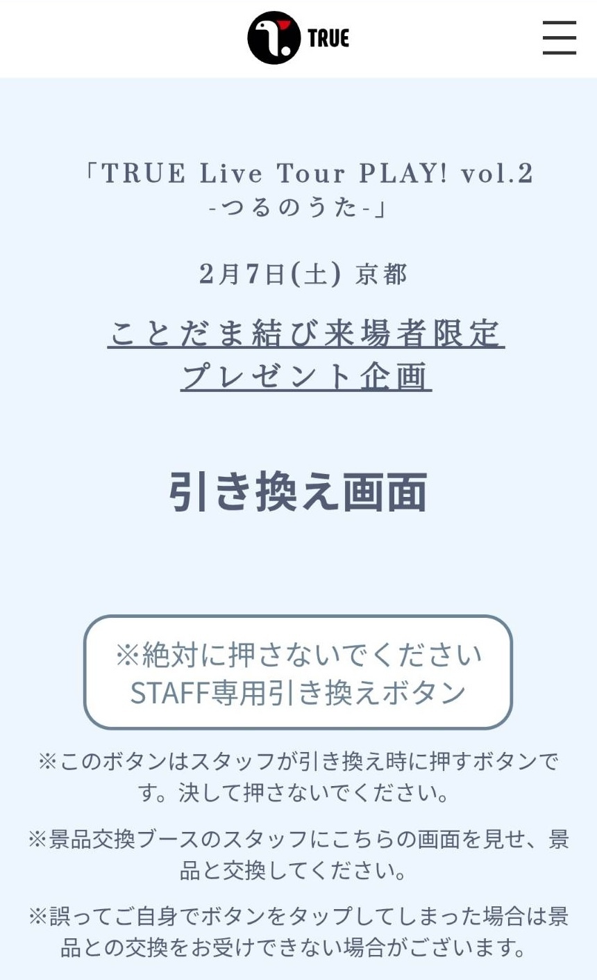 ※ご参加いただくにはTRUE Official Fan Club「ことだま結び」へのご登録が必要です。ご来場の、ことだま結び会員様へのプレゼントとなります。