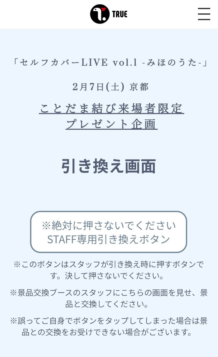 ※STAFF専用引き換えボタンは押さないようにご注意ください。お客様ご自身でSTAFF専用引き換えボタンを押された場合、プレゼントはお渡しいたしかねます。